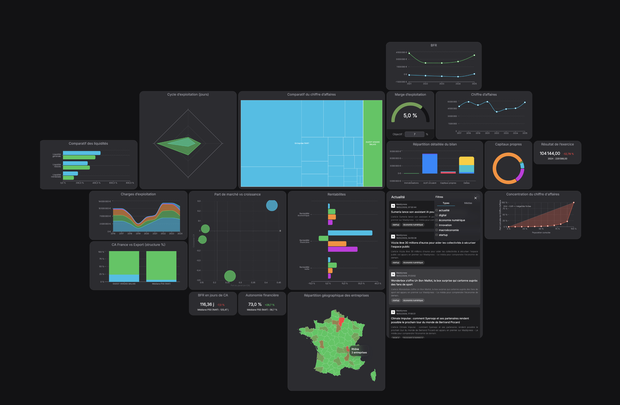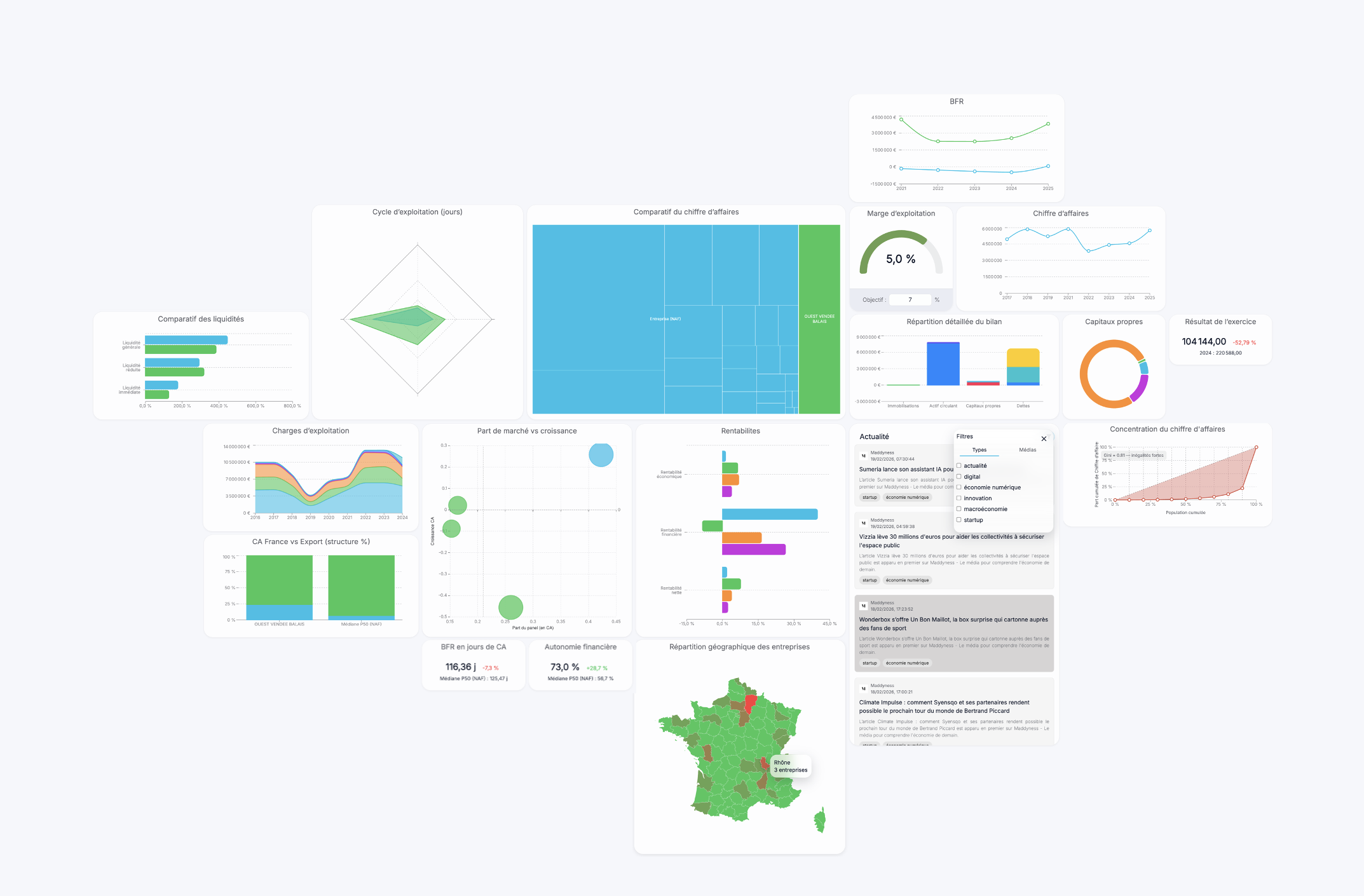 Accédez instantanément aux données comptables de millions d’entreprises françaises et comparez-les à leur secteur grâce à des tableaux de bord interactifs. Conçu pour les cabinets, investisseurs et professionnels de la finance.